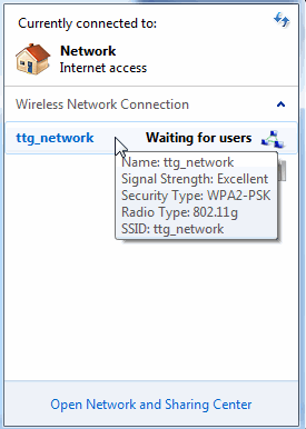 Your next job is to verify the Ad Hoc network by clicking on the wireless icon on the task bar. You should see the name of the network and alongside it a message “Waiting for users”.