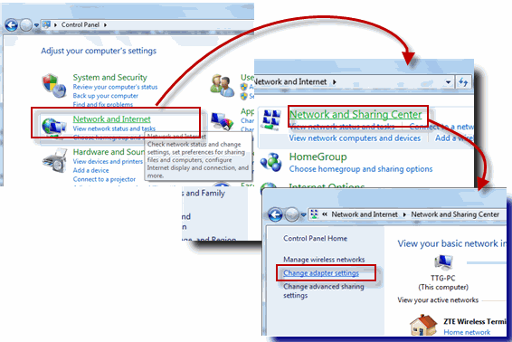 Go to Control Panel from the start menu and click on Network and Internet > Network and Sharing Center. A windows appears. Click on the Change adapter settings from the left sidebar.