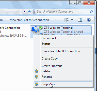 Under the Network Connections windows, select the correct icon representing your wireless modem and right-click on it and select Properties from the context menu.