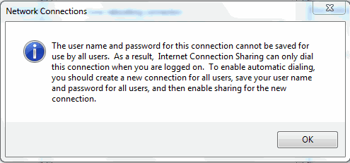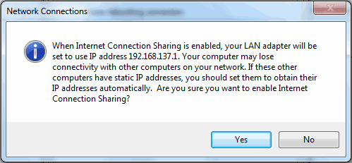 1. Check the box “Allow other network user to connect through this computer’s Internet connection”. Once you select this option, you will get a message like this: