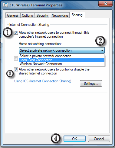 3. You can allow other network user to control or disable the shared Internet connection by selecting the check box.